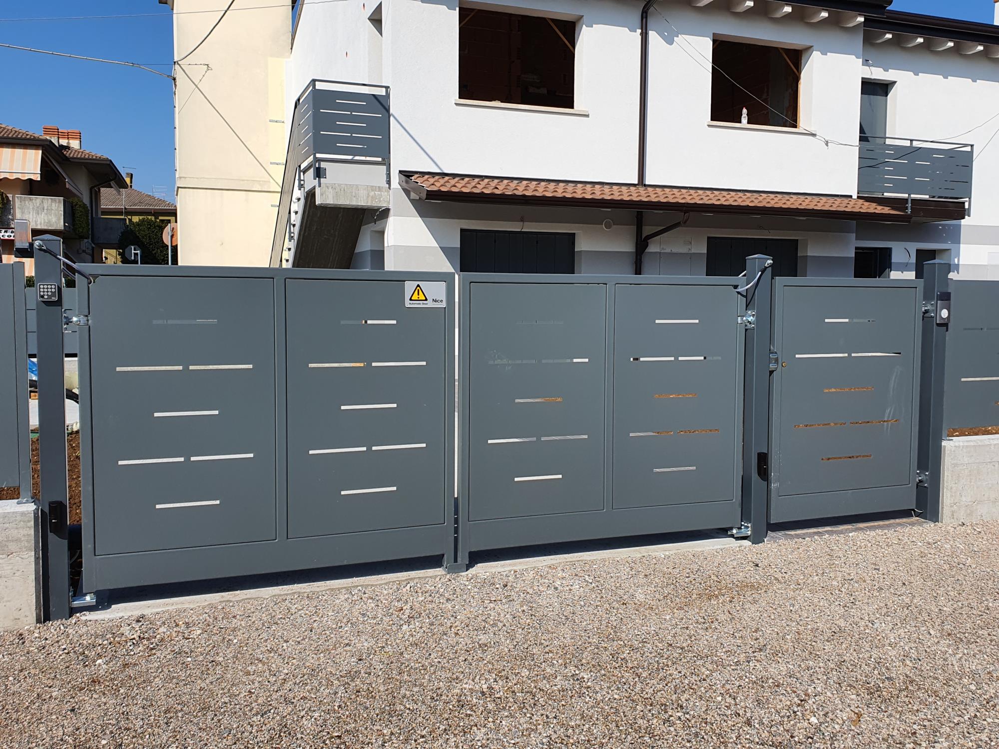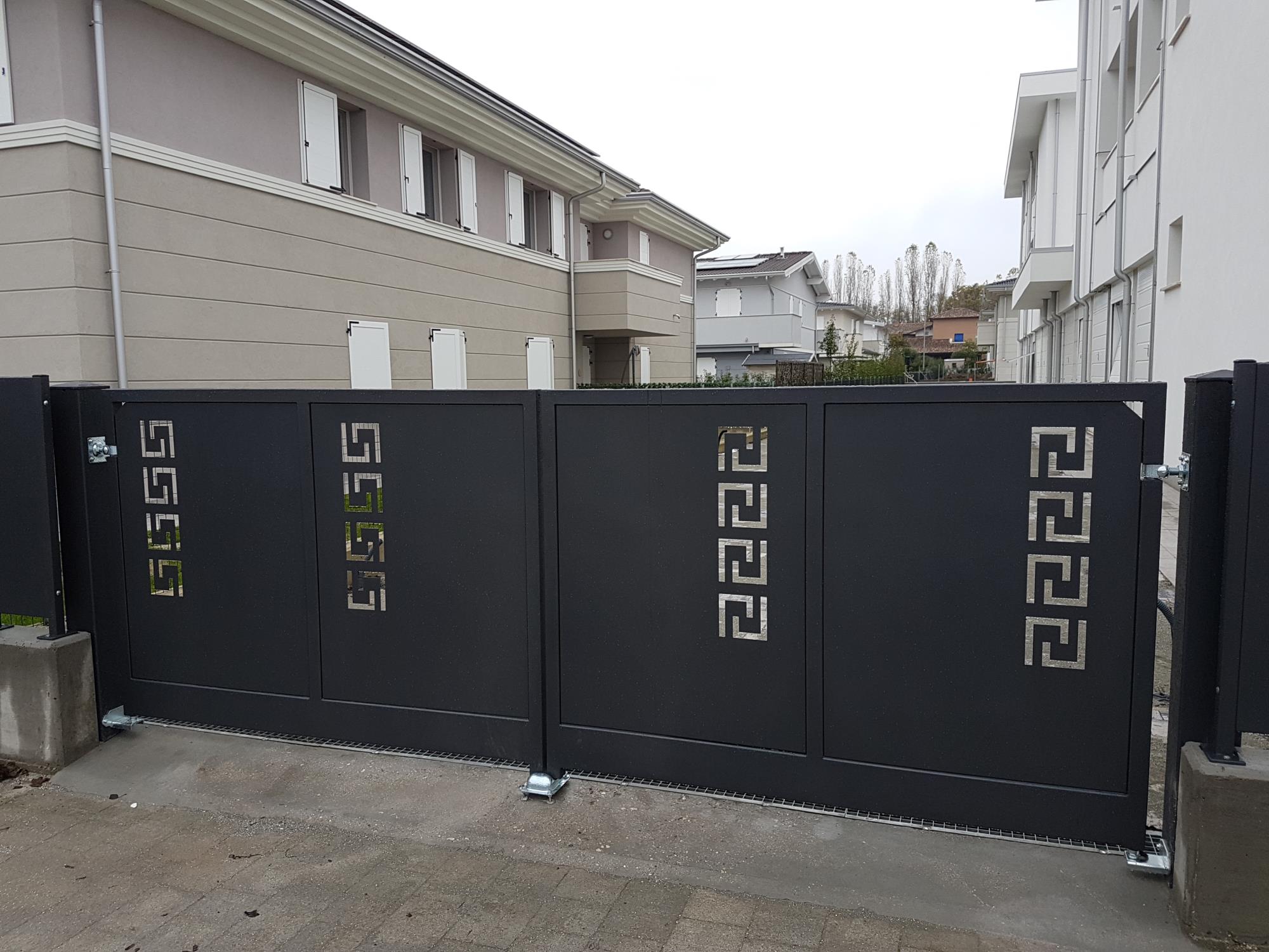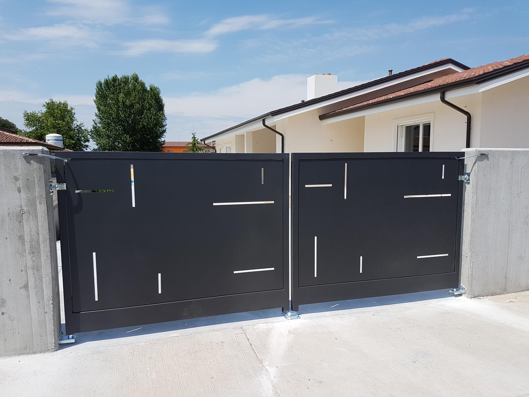 Cancello ad ante con tamponatura interna in lamiera con qualsiasi disegno richiesto.