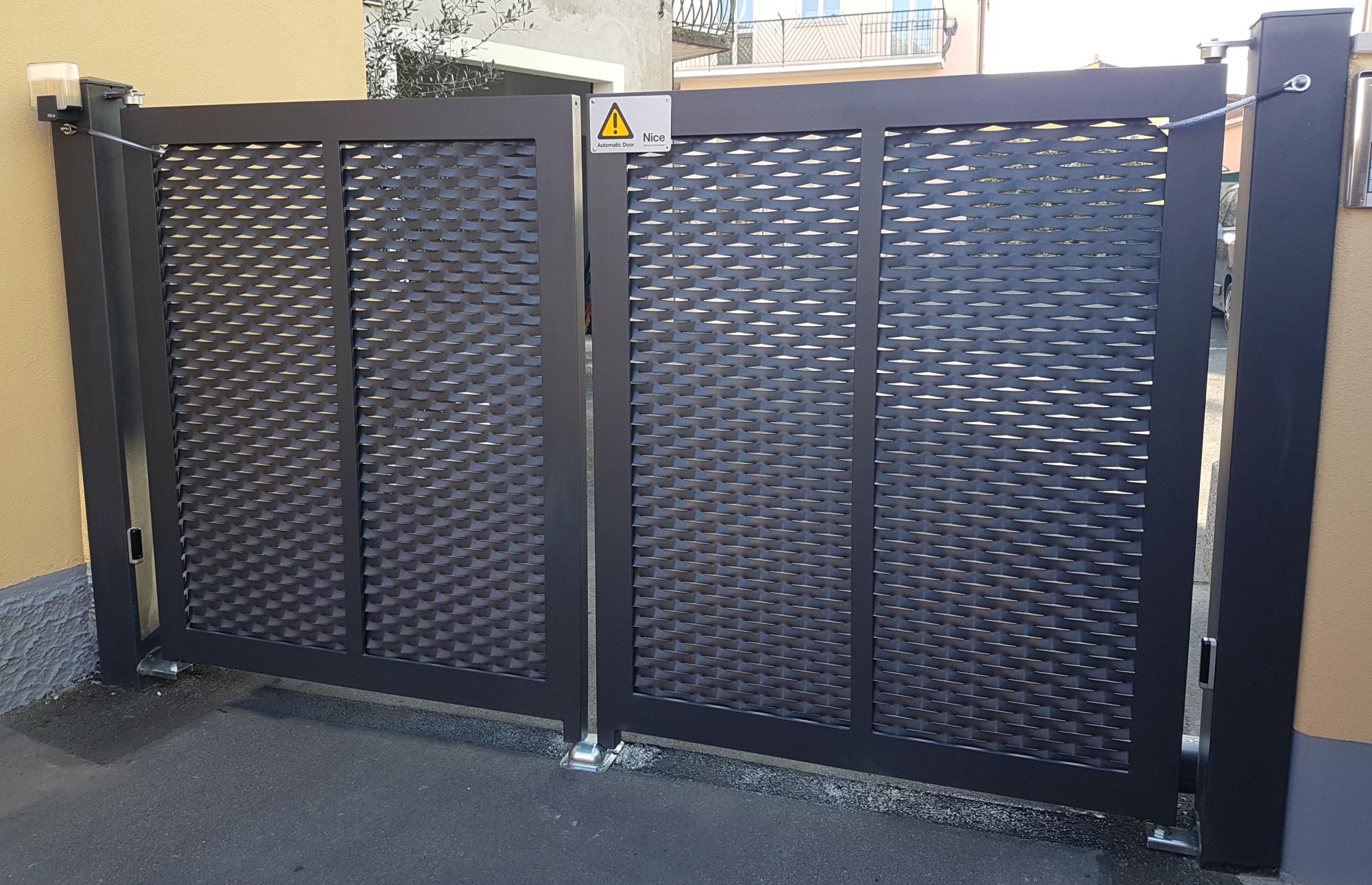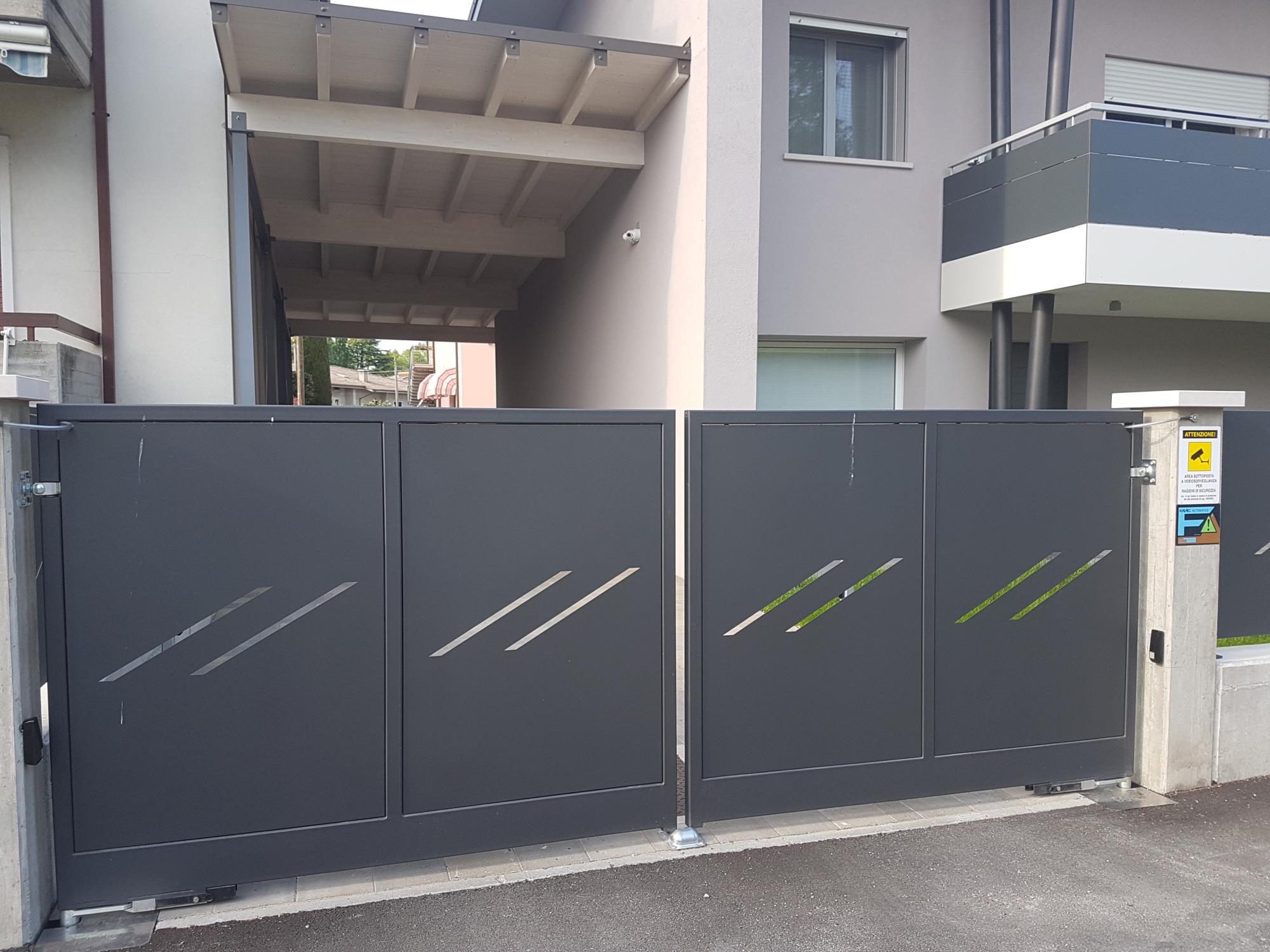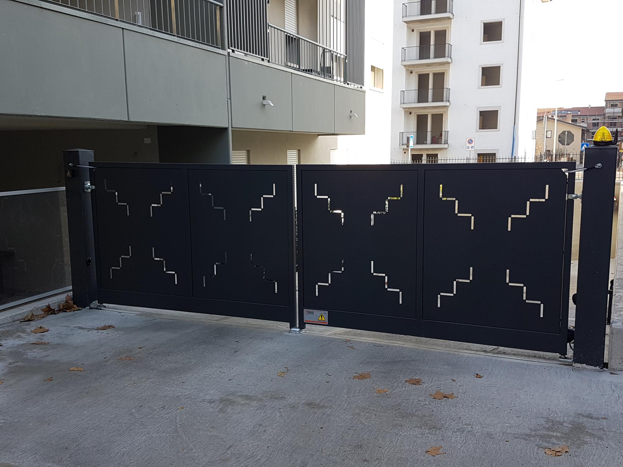 Cancello ad ante con tamponatura interna in lamiera con qualsiasi disegno richiesto.